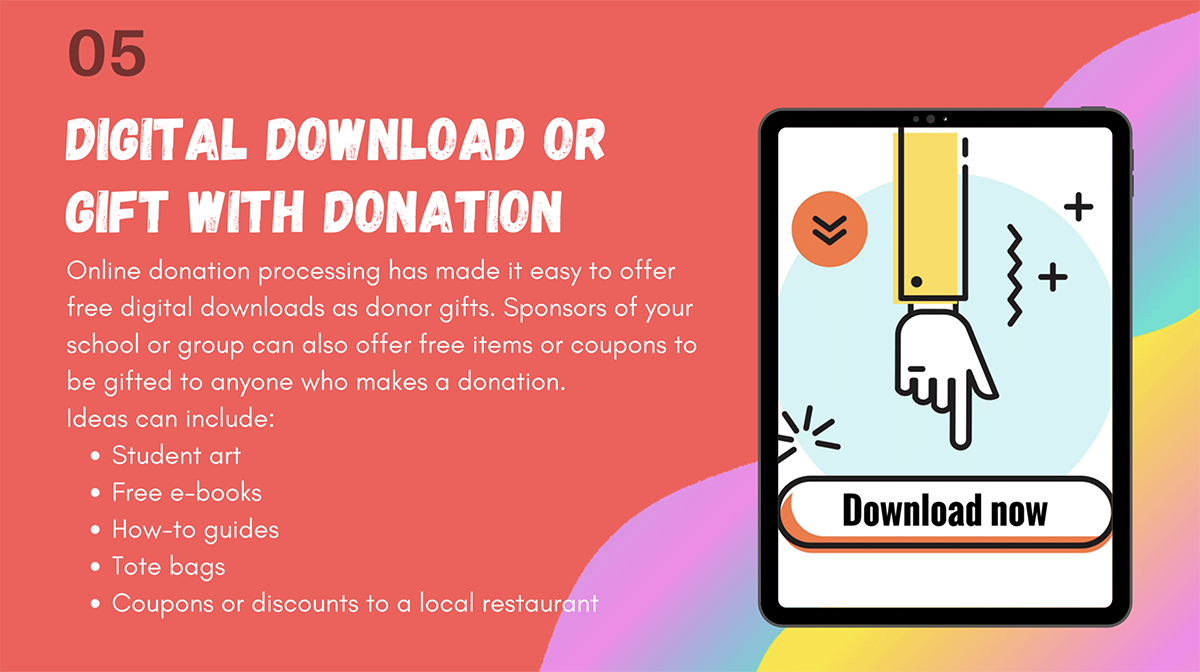 Online donation processing is effortless these days. And when donors make a fundraising donation, you could give them a digital download as a gift. For instance, you could give away student art, e-books, or discounts and coupons.
